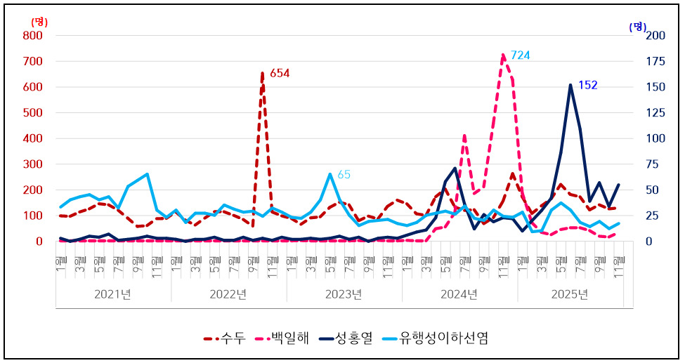 최근 5년 추이를 보면 이들 질환은 매년 3월부터 증가한다. 수두와 유행성이하선염은 봄철(4~6월)에 환자가 많고 학령기 발생 빈도가 높다.