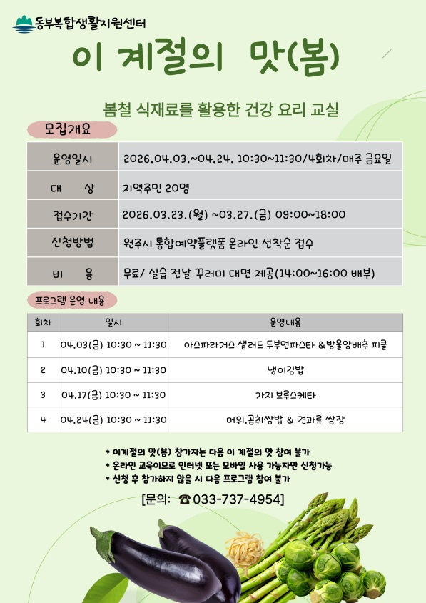 [스포츠서울ㅣ원주=김기원 기자]원주시 동부복합생활지원센터는 오는 23일부터 ‘이 계절의 맛 (봄)’ 건강 요리 교실 프로그램 참여자를 모집한다.