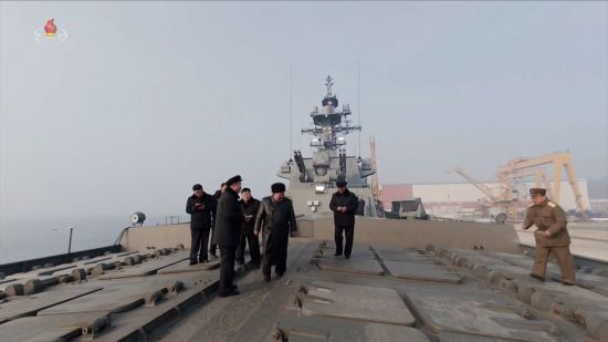 김정은 북한 국무위원장이 지난 3~4일 취역을 앞둔 5천t급 신형 구축함 '최현호'를 찾아 훈련 실태를 점검하고 함대지 전략순항미사일 시험발사를 참관했다고 조선중앙TV가 5일 보도했다. 김 위원장이 수행 간부들과 함께 구축함 갑판 위를 걸으며 살펴보고 있다. [조선중앙TV 화면] 연합뉴스 |