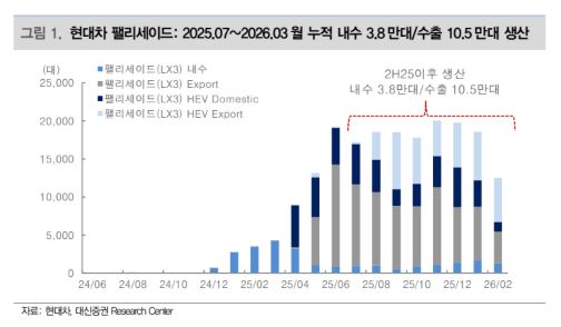 그는 “북미 대상 차종은 6만8482대로 발표했고, 한국은 트림별 생산물량을 알 수는 없지만 상대적으로 상위 트림 선택률이 높은 팰리세이드 특성상 지난해 하반기 이후 국내 생산물량(3만7517대) 중 상당부분 해당할 것으로 예상한다”고 분석했다.