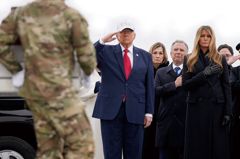 지난 7일 미국 본토로 돌아온 미군 병사의 유해가 담긴 관에 거수경례를 하는 도널드 트럼프 미국 대통령. /AP 뉴시스 |