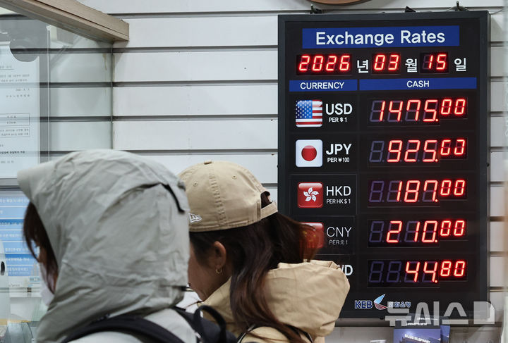 [서울=뉴시스] 최진석 기자 = 이란 전쟁이 장기화될 조짐을 보이며 급등한 국제 유가에 원·달러 환율이 오름세를 보이고 있는 15일 서울 중구 명동 한 환전소에 환전 시세가 보이고 있다. 이란 전쟁이 발발하자 환율은 지난 4일 야간 거래에서 17년만에 1500원선을 넘었다. 이는 글로벌 금융위기 이후 처음이다. 2026.03.15. myjs@newsis.com |