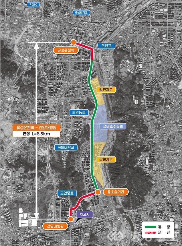 유성온천역~만년교와 용소삼거리~건양대병원 구간에 전용차로를 구축해 기존 도안동로 버스전용차로와 연계함으로써 굴절버스의 정시성과 운행 안정성을 높이고 차량 흐름 간섭을 줄여 안전한 대중교통 환경을 마련할 계획이다.