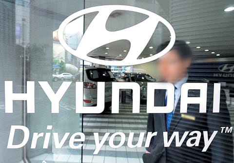 서울의 한 현대자동차 영업소에서 직원이 유리 창문의 현대차 로고 뒤에 서 있다. /AFP 연합 제공 |