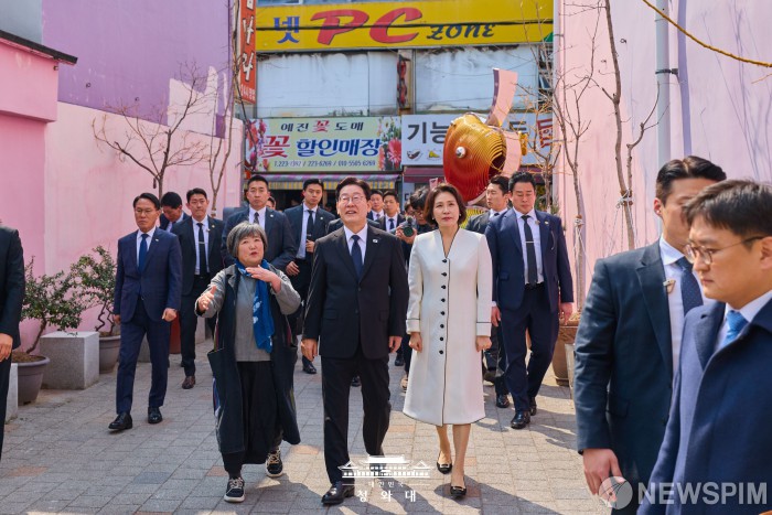 [서울=뉴스핌] 이재명 대통령과 김혜경 여사가 지난 15일 경남 창원시 마산합포구 창동예술촌 아트센터에서 열린 지역예술인과의 대화에 참석하고 있다. [사진=청와대] 2026.03.16 photo@newspim.com