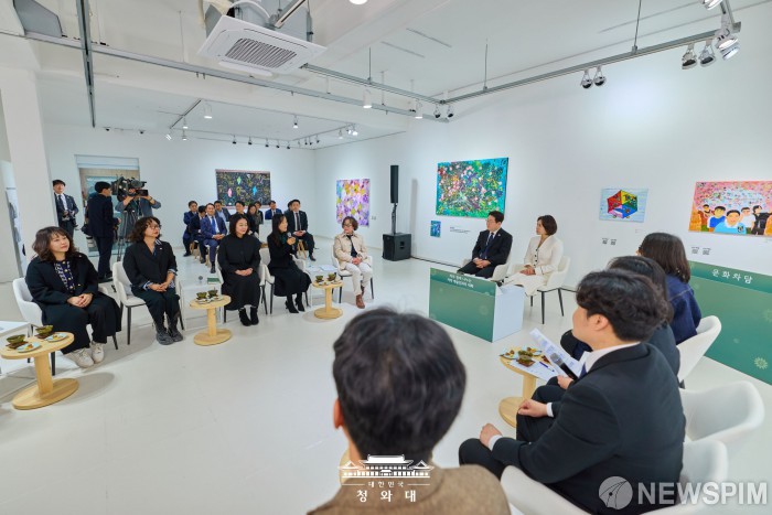 [서울=뉴스핌] 이재명 대통령과 김혜경 여사가 지난 15일 경남 창원시 마산합포구 창동예술촌 아트센터에서 열린 지역예술인과의 대화에 자리하고 있다. [사진=청와대] 2026.03.16 photo@newspim.com