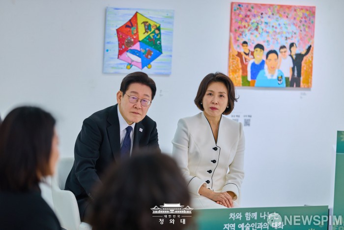 [서울=뉴스핌] 이재명 대통령과 김혜경 여사가 지난 15일 경남 창원시 마산합포구 창동예술촌 아트센터에서 열린 지역예술인과의 대화에서 참석자들의 발언을 듣고 있다. [사진=청와대] 2026.03.16 photo@newspim.com