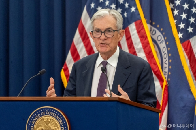 [워싱턴=신화/뉴시스] 제롬 파월 미 연방준비제도(Fed·연준) 의장이 28일(현지 시간) 미국 워싱턴에서 기자회견하고 있다. 연준은 이날 기준금리를 3.5%~3.75%로 동결했다. 파월 의장은 도널드 트럼프 행정부의 소환장 발부에 응했는지에 대해서는 언급을 자제했다. 2026.01.29. /사진=민경찬 |