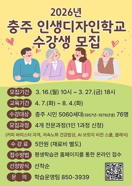 (충주=국제뉴스) 김상민 기자 = 충북 충주시 평생학습관이 5060세대 시민의 인생 2막 설계를 지원하기 위해 '2026년 충주 인생디자인학교' 수강생을 모집한다고 밝혔다.