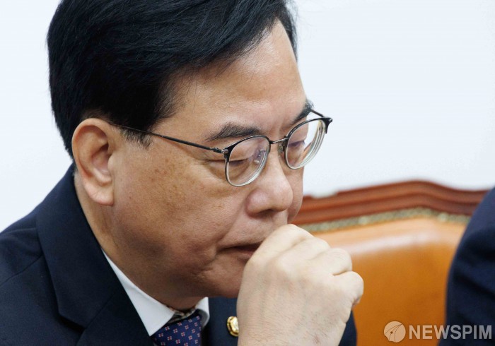 [서울=뉴스핌] 윤창빈 기자 = 송언석 국민의힘 대표가 16일 오전 서울 여의도 국회에서 열린 최고위원회의에서 잠시 생각에 잠겨 있다. 2026.03.16 panbin@newspim.com