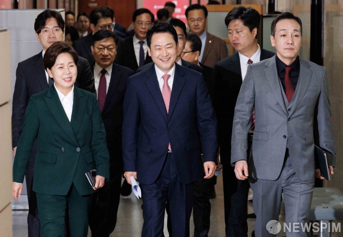 [서울=뉴스핌] 윤창빈 기자 = 장동혁 국민의힘 대표, 송언석 원내대표 등 최고위원들이 16일 오전 서울 여의도 국회에서 열린 최고위원회의에 참석하고 있다. 2026.03.16 panbin@newspim.com