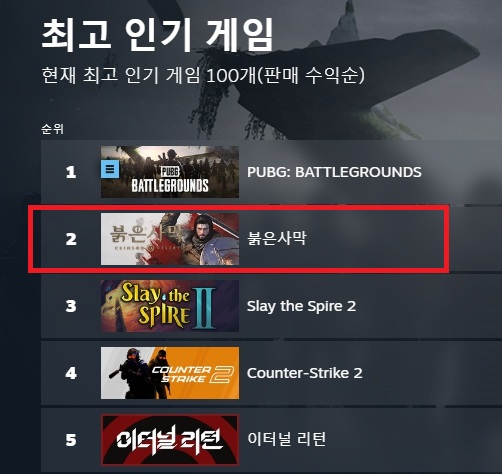 이는 붉은사막을 향한 글로벌 시장의 기대감이 반영됐기 때문인 것으로 풀이된다. 오는 20일(한국시간) 글로벌 시장에 동시 출시되는 붉은사막은 스팀 최고 인기제품 차트에서 글로벌 2위에 오르며 흥행을 예고한 상태다. 아직 출시되지도 않은 상태에서 예약구매 만으로 인기제품 상위권에 이름을 올린 것을 붉은사막이 유일하다. 특시 현재 서비스 되고 있는 카운트 스트라이크2, 이터널리턴, 에이펙스 레전드, 연운 등 글로벌 흥행작들을 밀어내고 2위권에 오른 것은 의미가 크다.