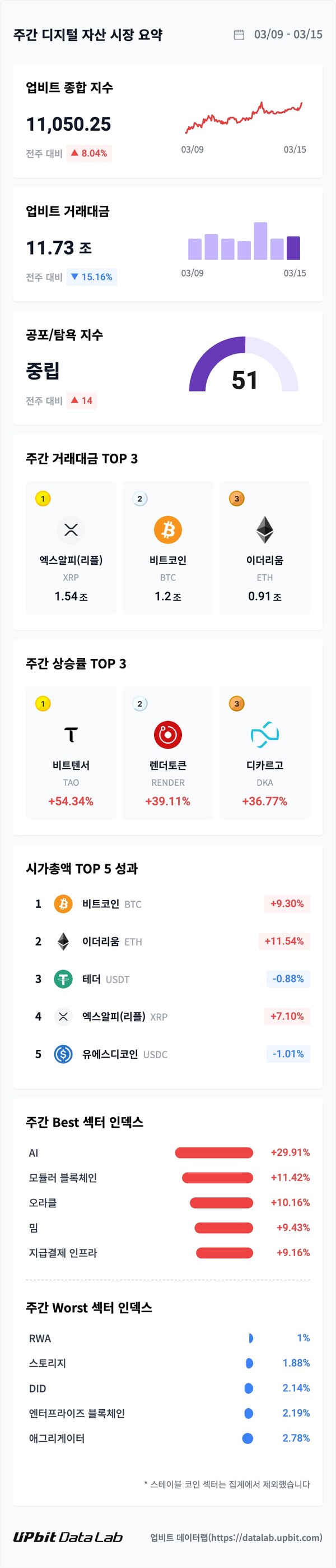 디지털자산 거래소 업비트의 데이터랩 주간 리포트에 따르면, 지난 한 주간 업비트 종합지수는 전주 대비 8.04% 상승해 1만1050.25포인트를 기록했다. 같은 기간 업비트 알트코인 지수도 9.72% 올랐다.