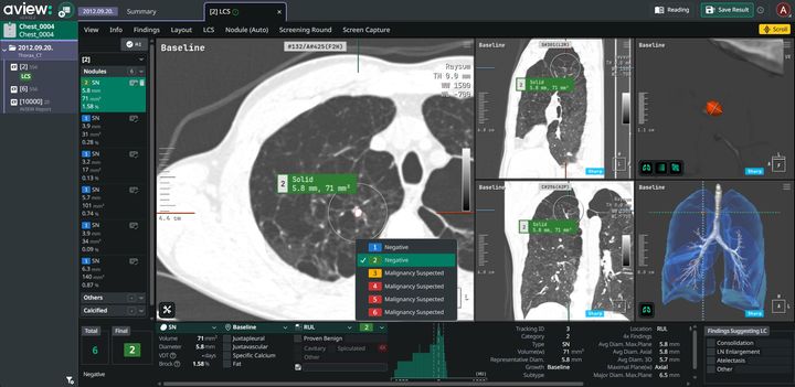 16일 코어라인소프트에 따르면 AVIEW LCS는 폐결절 자동 검출과 정량 분석을 기반으로 이전 검사와의 비교, 성장 속도 분석 등 추적관리 기능을 제공한다.