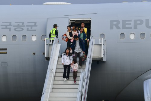 South Korean citizens disembark from an Air Force KC-330 transport aircraft after returning home as part of the “Operation Desert Shine” evacuation mission for nationals in the Middle East. /Ministry of National Defense |