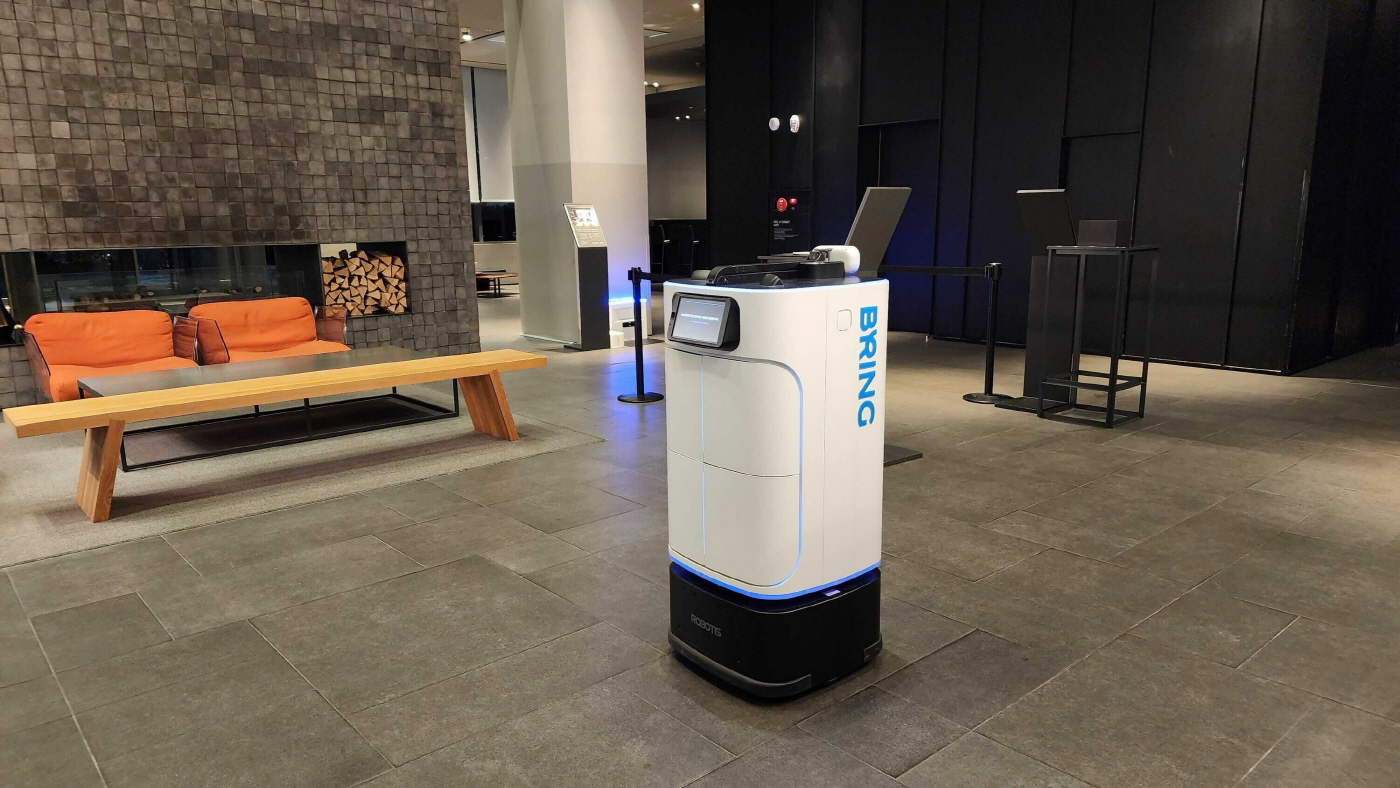 카카오모빌리티 로봇 서비스 '브링(BRING)'이 호텔에서 고객에게 어메니티를 배송하기 위해 이동하는 모습./카카오모빌리티 |