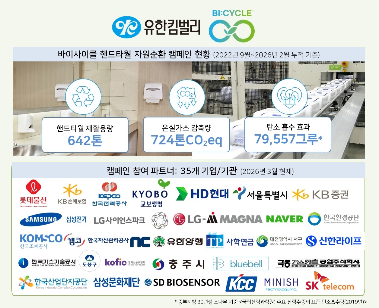 핸드타월 자원순환 사업을 통해 지난 3년 6개월간 누적 재활용된 핸드타월은 약 642톤이다. 이를 통해 감축한 온실가스는 약 724톤으로 집계됐다. 이는 중부지방 30년생 소나무 약 7만9557그루의 연간 탄소 흡수량에 해당하는 수준이다. 유한킴벌리는 해당 감축 효과를 LCA 전과정평가와 제3자 검증을 통해 객관적으로 산정하고 있다고 설명했다.