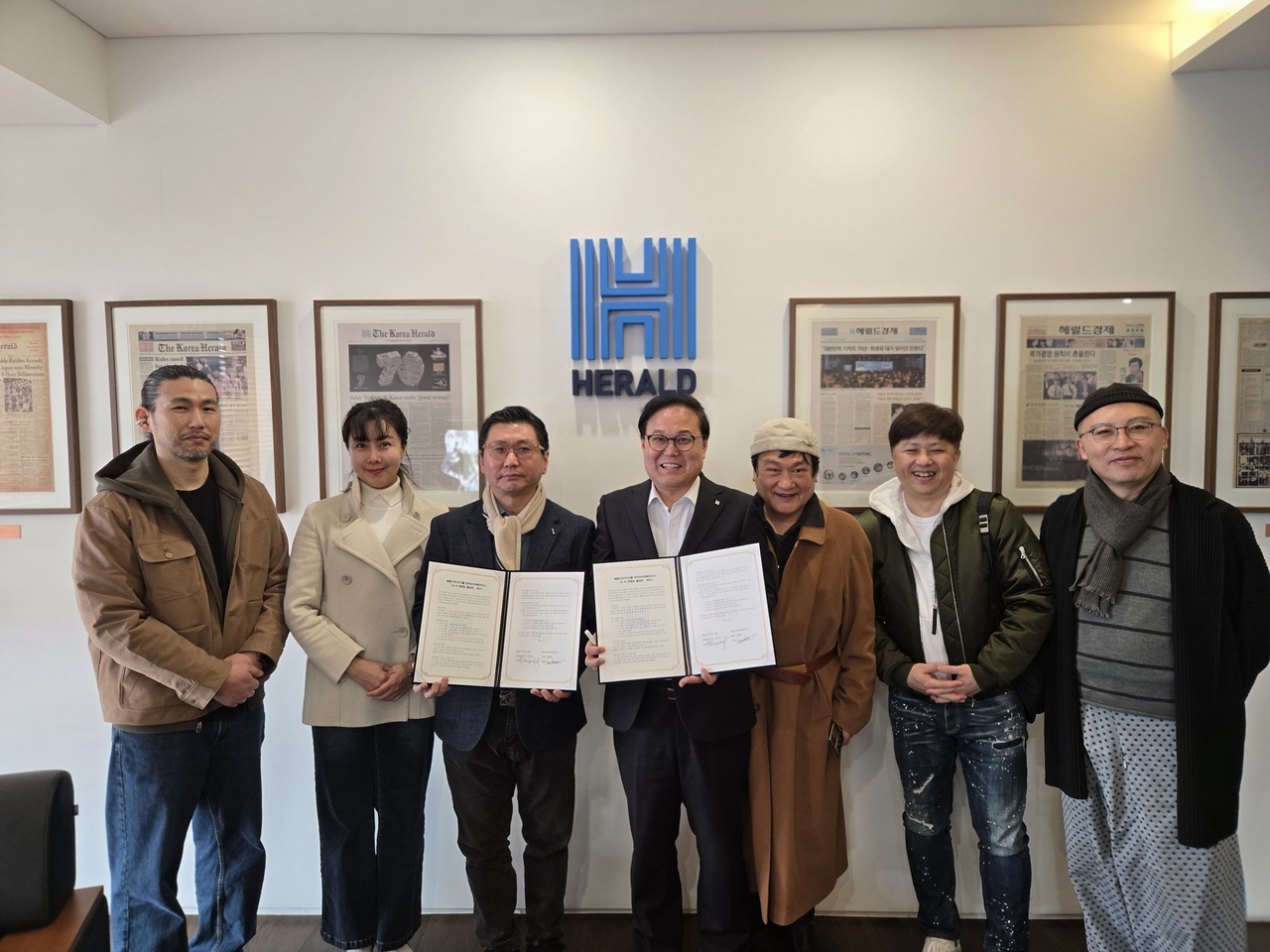헤럴드미디어그룹(대표 최진영)과 한국AI마케팅연구소가 AI 기반 K-콘텐츠의 새로운 생태계 창출과 활성화를 위한 MOU를 체결했다. 이동현(왼쪽 세번째) 한국AI마케팅연구소 대표와 김영상(왼쪽 네번째) 코리아헤럴드 사장이 MOU 체결식을 진행하고 있는 가운데, 박성한(맨왼쪽) 크레모픽쳐스 대표, 선우림(왼쪽 두번째) 배우, 김인식(왼쪽 다섯번째) 영화감독, 오상준(왼쪽 여섯번째) kai 대표, 한영용(맨오른쪽) 보주박물관장이 함께 촬영하고 있다. |