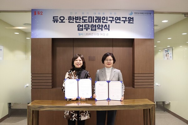 듀오 본사에서 열린 협약식에는 박수경 듀오 대표이사와 이인실 한반도미래인구연구원 원장을 비롯한 양측 관계자들이 참석했다.