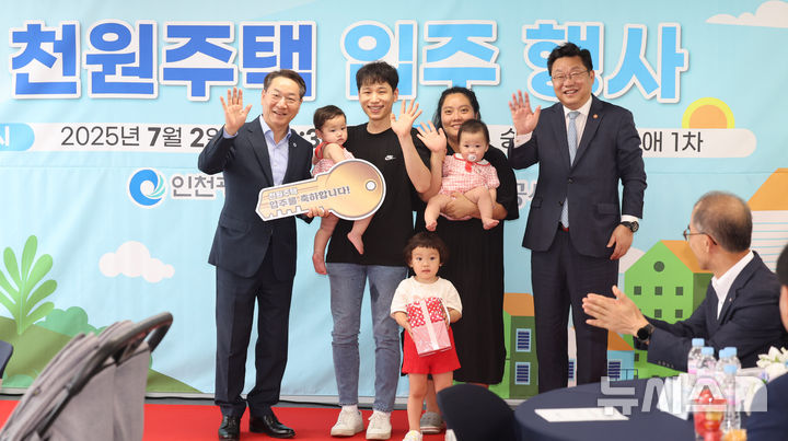 [인천=뉴시스] 전진환 기자 = 유정복(왼쪽) 인천시장과 주형환(오른쪽) 저출산고령사회위원회 부위원장이 2일 오전 인천 미추홀구 숭의동의 천원주택(매입임대주택) 입주행사에서 입주자 가족에게 열쇠 모양의 입주증서를 전달 후 기념촬영을 하고 있다. 2025.07.02. amin2@newsis.com |