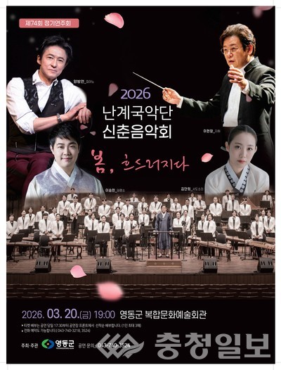 충북 영동군이 오는 20일 영동복합문화예술회관에서 74회 정기연주회인 '난계국악단 신춘음악회'를 개최한다고 밝혔다.