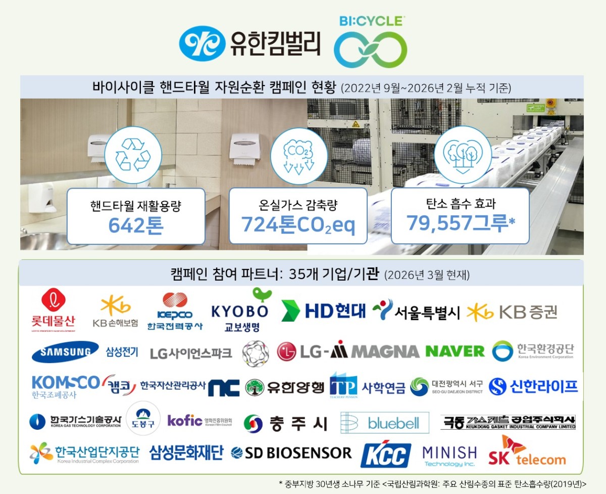 지난해 12월 유한킴벌리는 바이사이클 캠페인을 통해 온실가스 감축에 기여한 점을 인정받아 '2025 탄소중립 생활실천 국민대회'에서 탄소중립 생활실천 부문 최고 훈격인 대통령 표창을 수상했다.