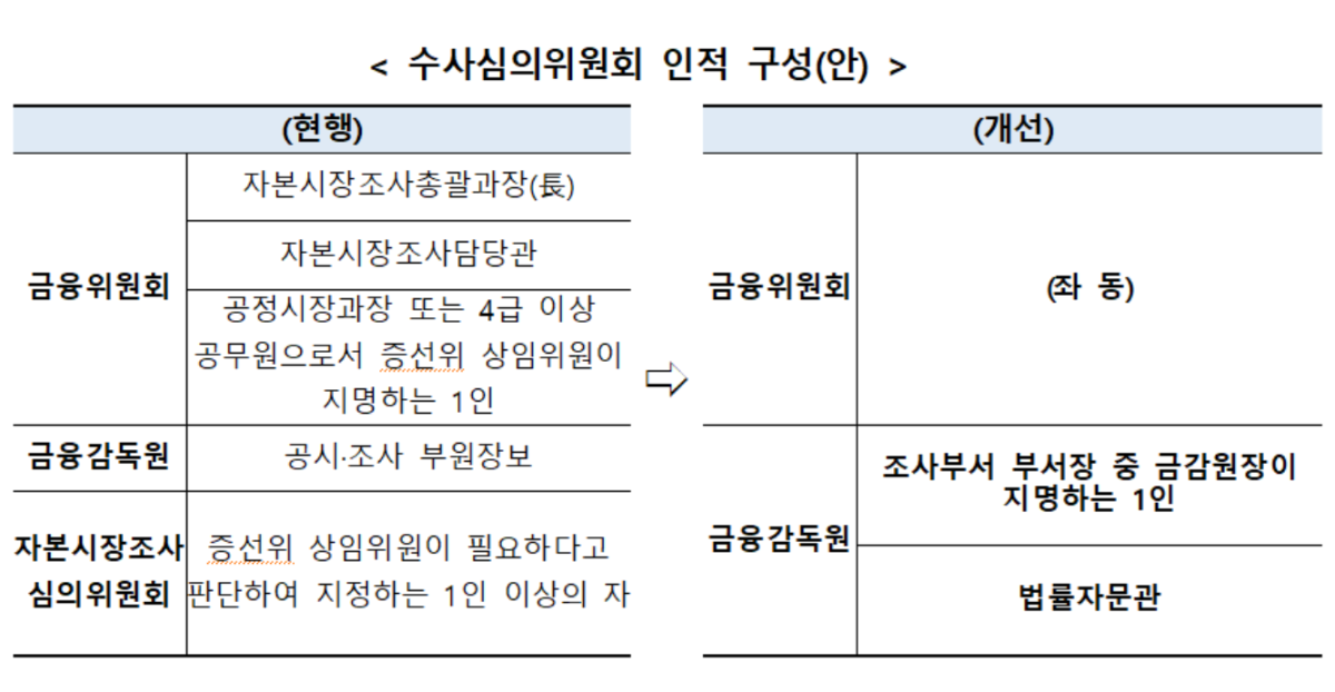 수사권 남용을 막기 위한 공적 통제 장치도 정비된다. 금융당국은 수사심의위원회의 인적 구성을 재편해 심의 기능을 강화하기로 했다. 위원 수는 기존과 동일한 5인을 유지하되 금융위 공정시장과장 또는 4급 이상 공무원, 금감원 조사부서장 등으로 참여 범위를 조정했다.