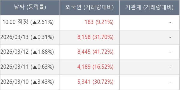 [서울=뉴스핌] 로보뉴스 = 16일 10시 15분 현재 와이랩(432430)은 전일 대비 2.61% (현재가 3,345원) 상승했고, 외국인이 최근 11일 연속 순매수(누적 10.88만 주, 잠정) 행진을 하고 있다.