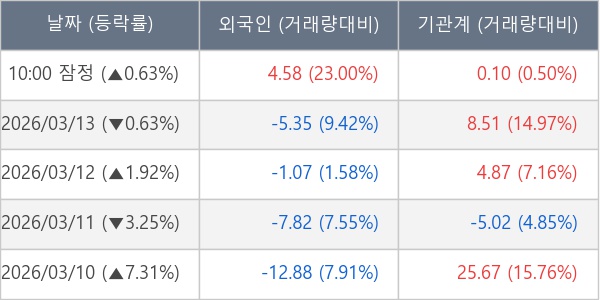 [서울=뉴스핌] 로보뉴스 = 16일 10시 15분 현재 대덕전자(353200)는 외국인과 기관이 각각 4.58 만 주, 0.10 만 주 순매수(잠정) 하면서 전일 대비 0.63% (현재가 63,700원) 상승하고 있다.