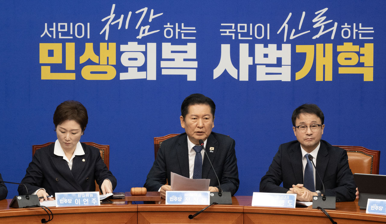 정청래(가운데) 더불어민주당 대표가 16일 오전 서울 여의도 국회에서 열린 최고위원회의에 참석해 모두발언을 하고 있다. 임세준 기자 |