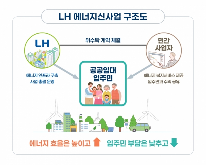또 LH는 이날 위탁사업자(헤리트, 엔라이튼, 한국전기차인프라기술 구성 컨소시엄)와 '에너지 신사업 민간 위탁사업' 협약을 체결한다고 밝혔다. 협약에 따라 LH는 사업을 총괄하고 민간사업자는 2029년 11월까지 LH로부터 사업을 위탁받아 전력거래소 등과 연계해 서비스 운영과 홍보를 수행할 계획이다.