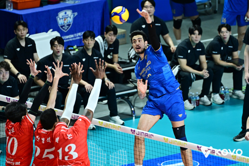 우리카드 아라우조가 지난 14일 한국전력과 경기에서 스파이크를 넣고 있다. KOVO 제공 |