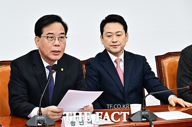 [더팩트 | 국회=배정한 기자] 송언석 국민의힘 원내대표(왼쪽)가 16일 오전 서울 여의도 국회에서 열린 최고위원회의에 참석해 모두발언을 하고 있다.