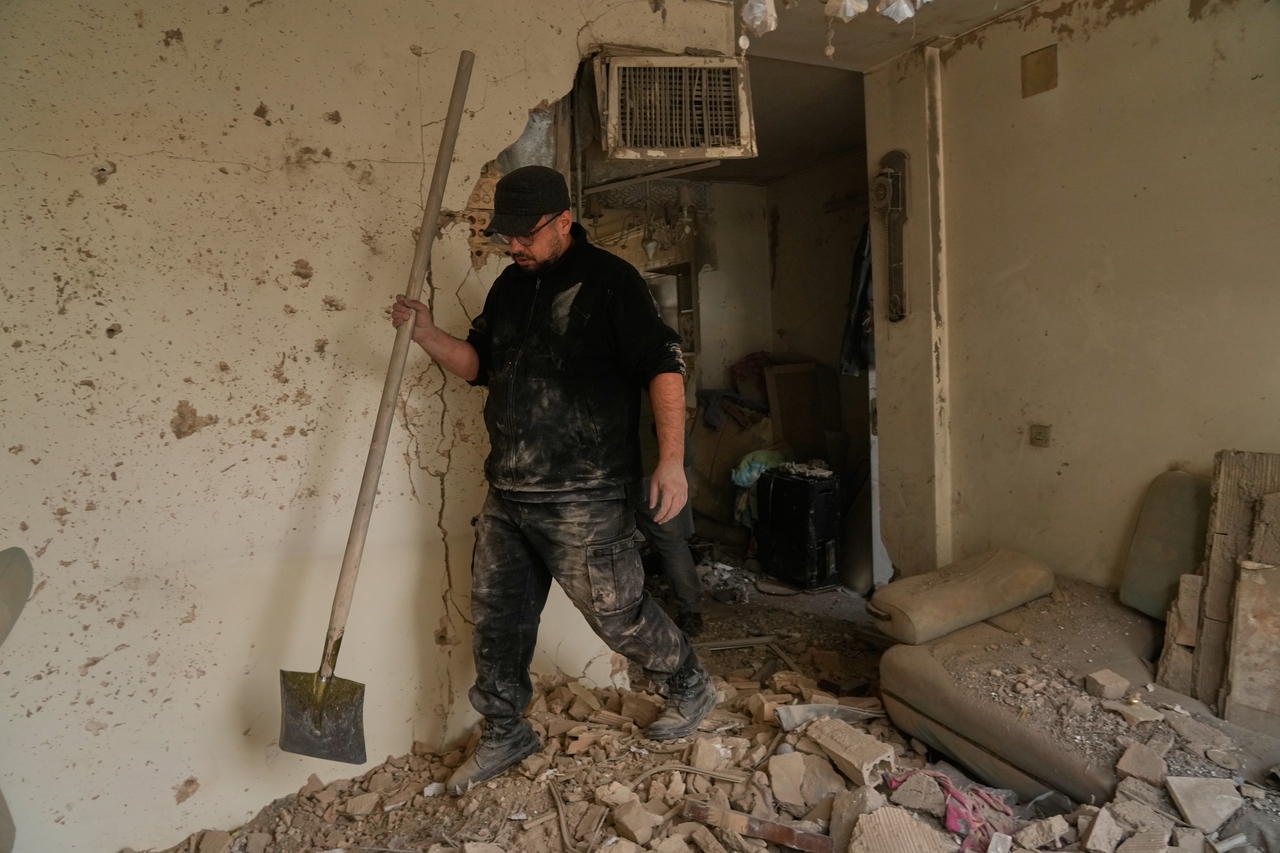 15일(현지시간) 이란 테헤란에서 한 남성이 인근 경찰서가 금요일에 발생한 미군과 이스라엘군의 공습으로 피해를 입은 자신의 아파트에서 잔해를 치우고 있다.[AP] |
