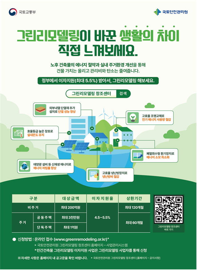정의경 국토부 국토도시실장은 “그린리모델링 이자지원 혜택과 무상 컨설팅을 결합해 비용 부담과 정보 부족으로 그린리모델링을 망설이던 국민의 고민을 덜어줄 것”이라며 “리모델링을 할 때 에너지 절감에 도움이 되는 그린리모델링에 적극 참여해 주길 바란다”고 말했다.