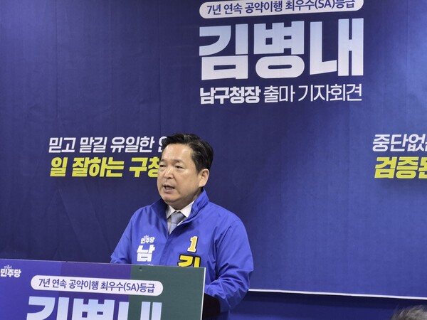 김병내 남구청장 예비후보 기자회견장면 / 사진.더쎈뉴스 |
