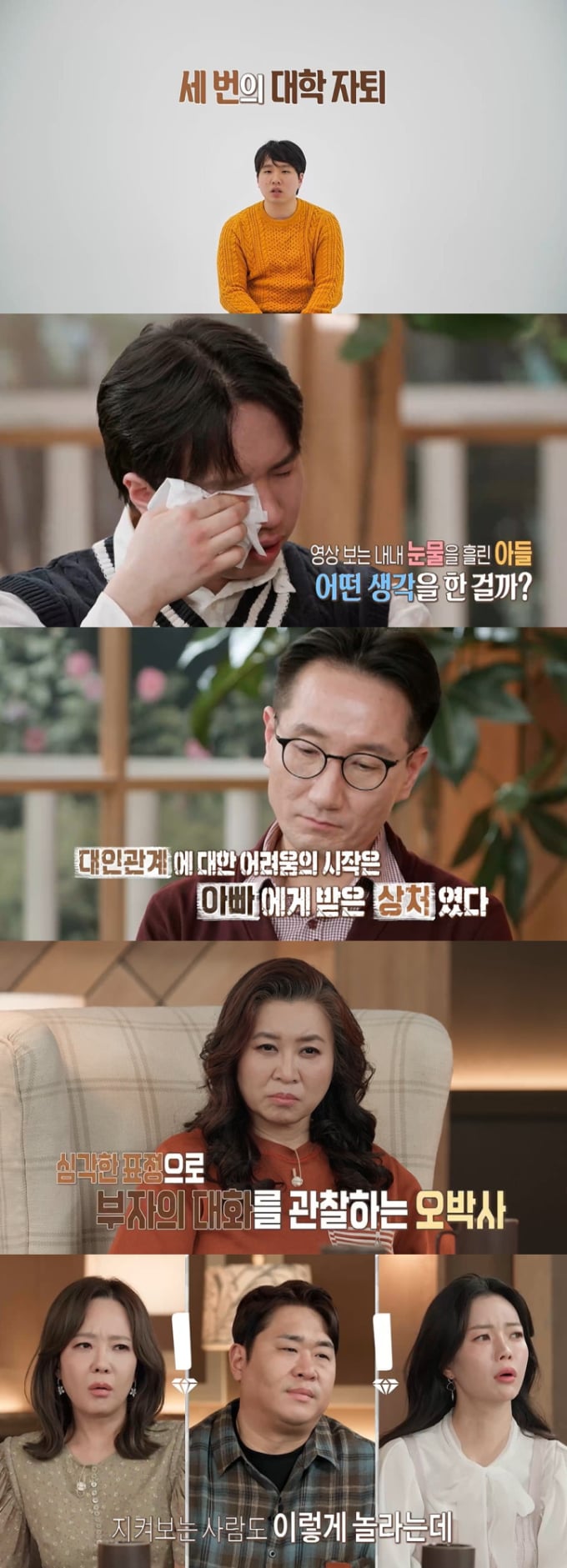 그러나 방송에서 아들은 아빠와 관련된 믿기 어려운 이야기들을 털어놓으며 스튜디오를 술렁이게 했다. 아들은 "아빠 때문에 극단적 시도를 한 적이 있다"고 고백하고, 대학교를 세 번이나 자퇴하게 만든 대인 관계의 어려움 역시 아빠에게서 비롯된 트라우마 때문이라고 전하며 오열했다. 특히 아빠는 전혀 기억하지 못하는 과거를 아들이 언급하자, 엄마는 "엄마도 기억해"라며 함께 눈물을 흘렸다.