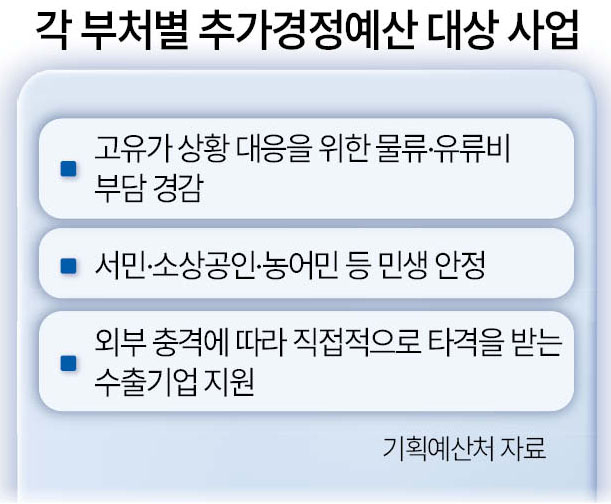 추경에는 에너지 수급 안정과 민생 부담 완화 관련 사업이 포함될 가능성이 거론됐다. 이날 회의에서는 석유류 최고가격제 운영에 따른 정유사 손실 보전 재원, 신재생 중심 에너지 전환 투자, 물류·운송업계 유류비 경감, 서민·소상공인 에너지 바우처 지급, 수출 피해 기업에 대한 물류·자금 지원 등이 논의된 것으로 전해졌다.