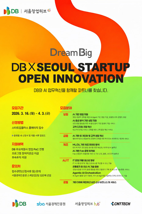 지원 접수는 3월 16일부터 4월 3일까지 진행된다. 서류 심사와 대면 심사(Meet-up)를 거쳐 최종 선정된 기업은 DB그룹 계열사와 공동으로 기술 검증(PoC)을 수행하게 된다. 성과 우수 기업에는 본사업 연계와 투자 검토 기회도 제공될 예정이다.
