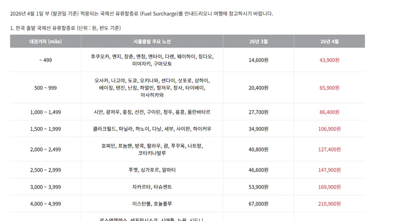 중동 사태에 따른 국제 유가 상승 영향으로 국내 항공사의 다음 달 국제선 유류할증료가 크게 치솟아 항공권 요금 부담이 커졌습니다.