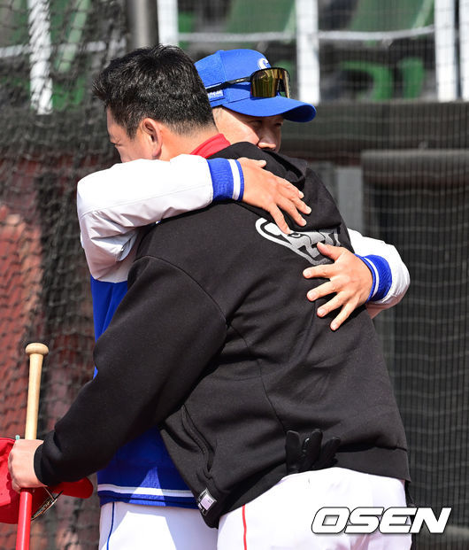 삼성 박진만 감독이 SSG 조동찬 코치와 반갑게 인사를 나누고 있다. 2026.03.16/ jpnews@osen.co.kr