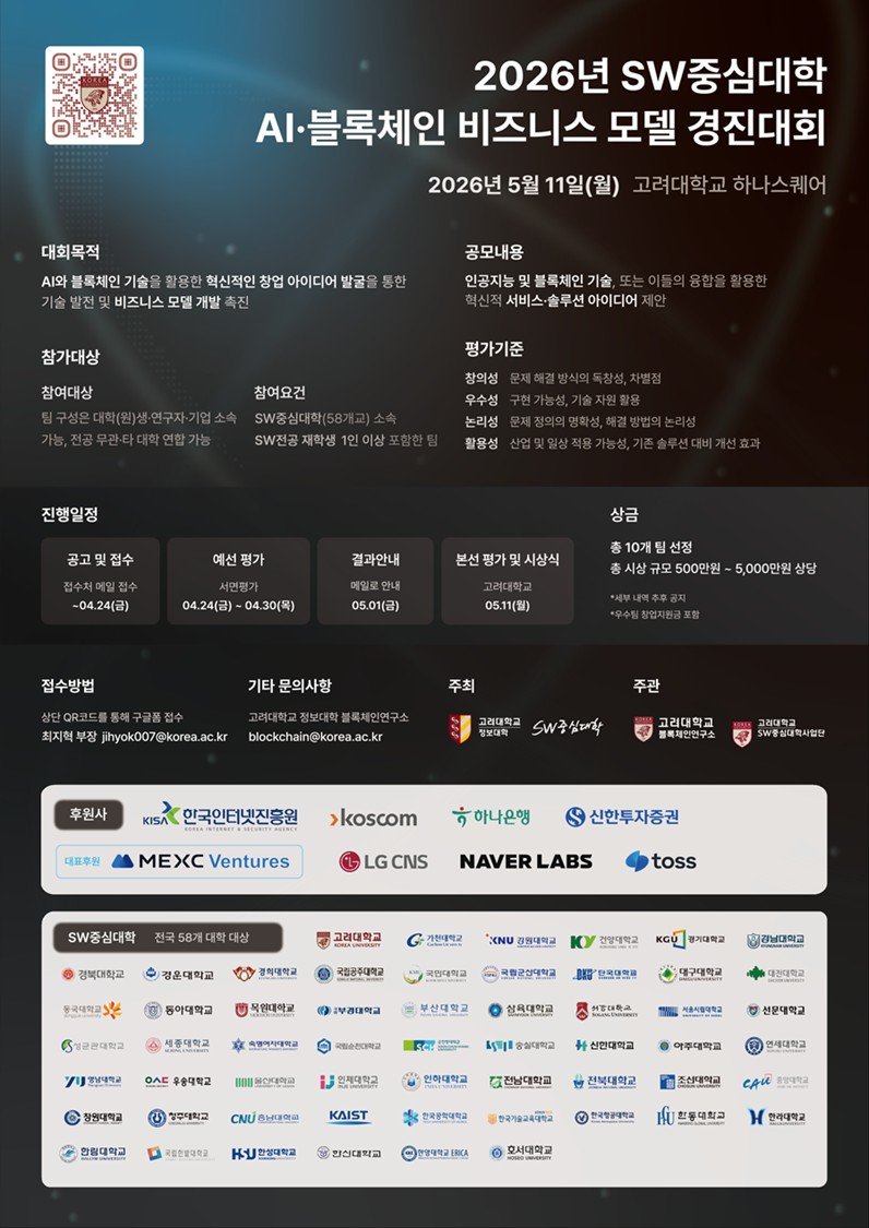 고려대 정보대학은 AI중심대학사업단과 공동으로 ‘2026년 AI·블록체인 비즈니스 모델 경진대회’를 개최한다고 16일 밝혔다.