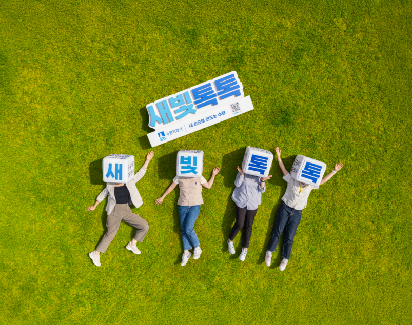 수원특례시 시민 참여 플랫폼 '새빛톡톡' 홍보 모델들이 수원시청 앞에서 QR코드와 '새빛톡톡' 큐브 머리 장식을 쓰고 포즈를 취하고 있다. |