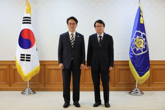 오영근 국가인권위원회 상임위원(오른쪽)이 지난달 20일 서울 종로구 정부서울청사에서 김민석 국무총리로부터 임명장을 받은 후 기념사진을 촬영하고 있다. 연합뉴스 |