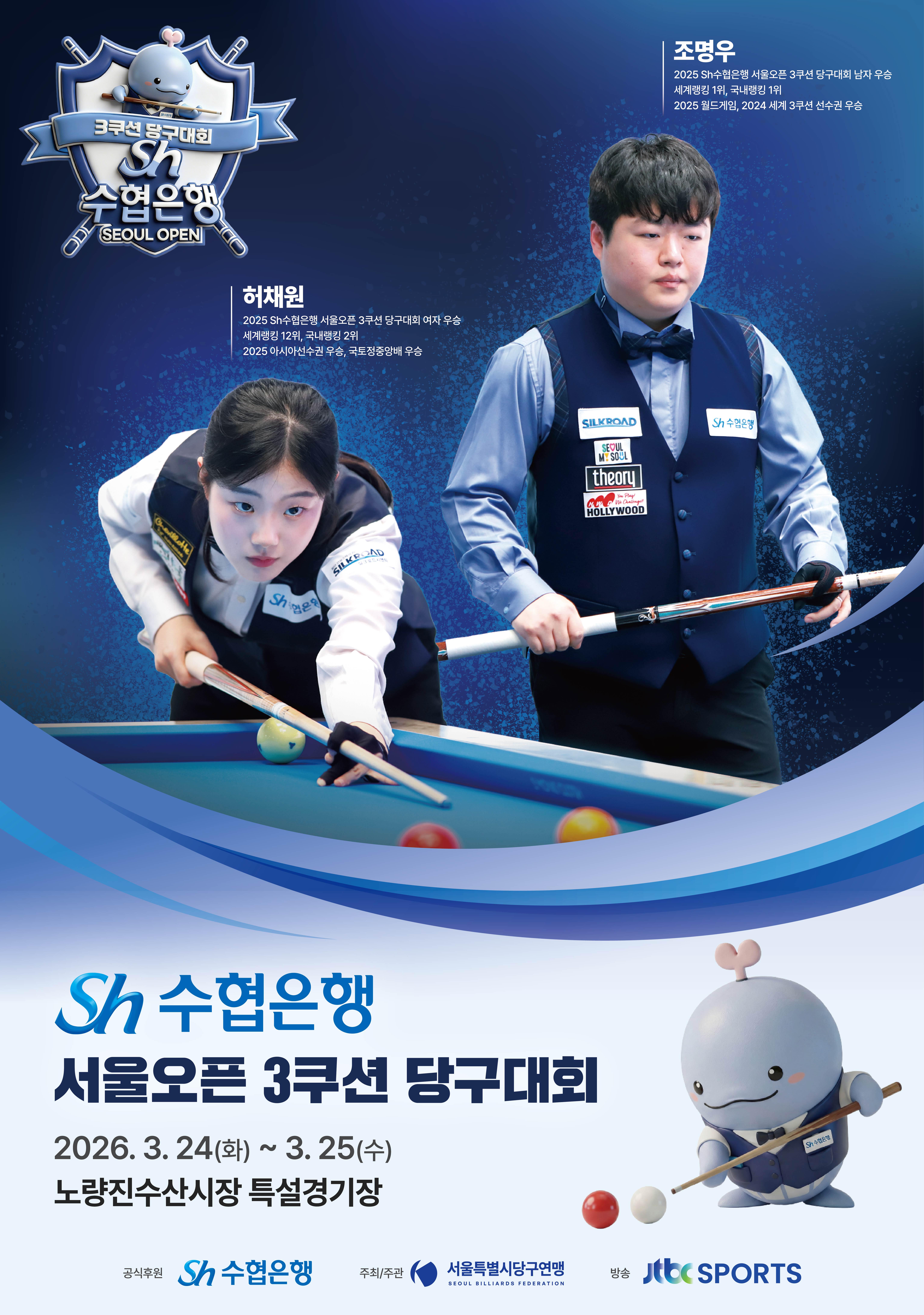 Sh수협은행은 오는 3월 24일과 25일, 노량진수산시장 특설경기장에서 'Sh수협은행 서울오픈 3쿠션 당구대회' 본선을 개최한다고 16일 밝혔다.
