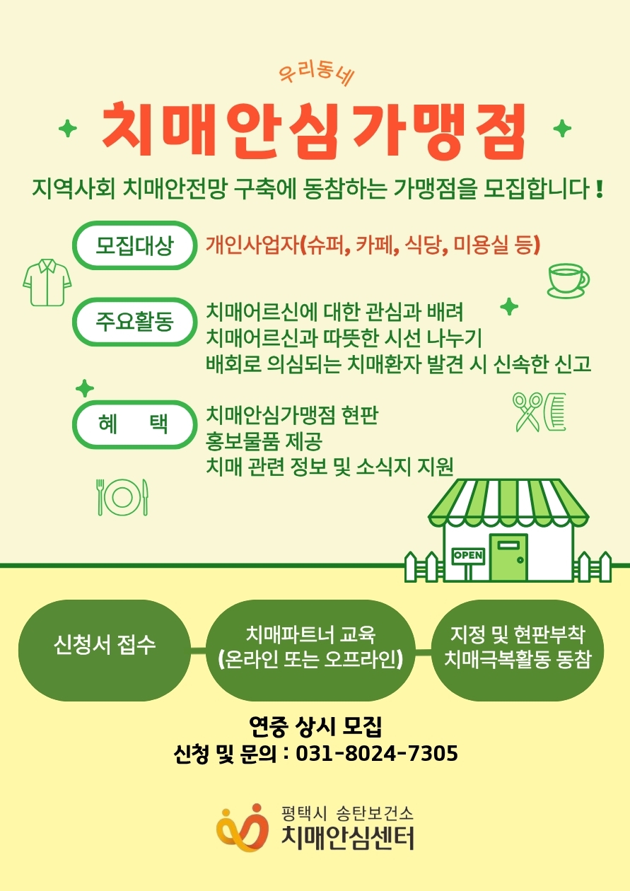 가맹점으로 지정되면 치매 파트너 교육을 이수하고, 치매 인식 개선 활동 및 위기 상황 신속 대응 역할을 수행하게 된다.
