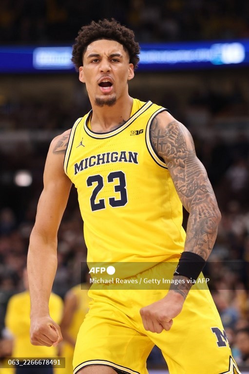 (미국=국제뉴스) 윤철식 기자 = 15일(현지시간) 미시간 울버린스의 야셀 렌데보르그가 유나이티드 센터에서 열린 2026 빅텐 남자 농구 토너먼트 결승전 전반전에서 퍼듀 보일러메이커스를 상대로 득점을 축하하고 있다.