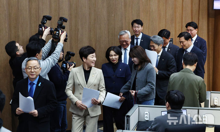 [서울=뉴시스] 김명년 기자 = 더불어민주당 초선 모임 '더민초' 소속 의원들이 16일 오전 서울 여의도 국회 소통관에서 '윤석열정권 정치검찰 조작기소 진상규명을 위한 국정조사 추진 기자회견'을 마치고 이동하고 있다. 2026.03.16. kmn@newsis.com