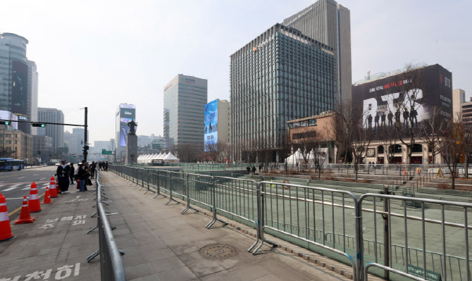 [포토]BTS 컴백 공연으로 벌써부터 펜스쳐진 광화문광장