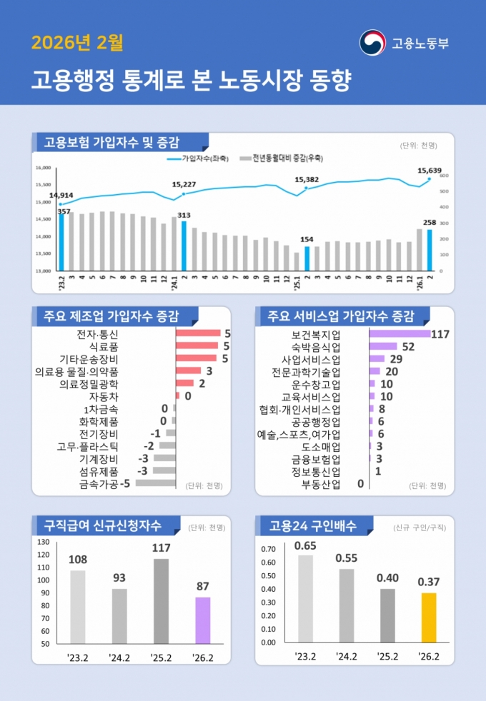 16일 고용노동부가 발표한 '2026년 2월 고용행정 통계로 본 노동시장 동향'에 따르면 지난달 고용보험 상시가입자 수는 1563만9000명으로 전년 대비 25만8000명(1.7%) 증가했다.